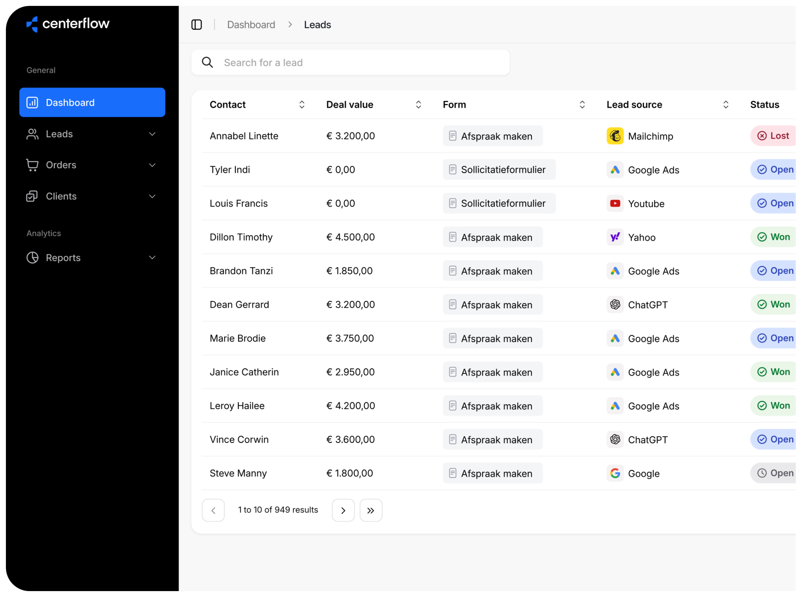 De meeste tools geven geaggregeerde data zoals “10 leads uit Google Ads” en laten je raden welke dat waren. Centerflow laat per lead exact de bron, campagne en het apparaat zien.