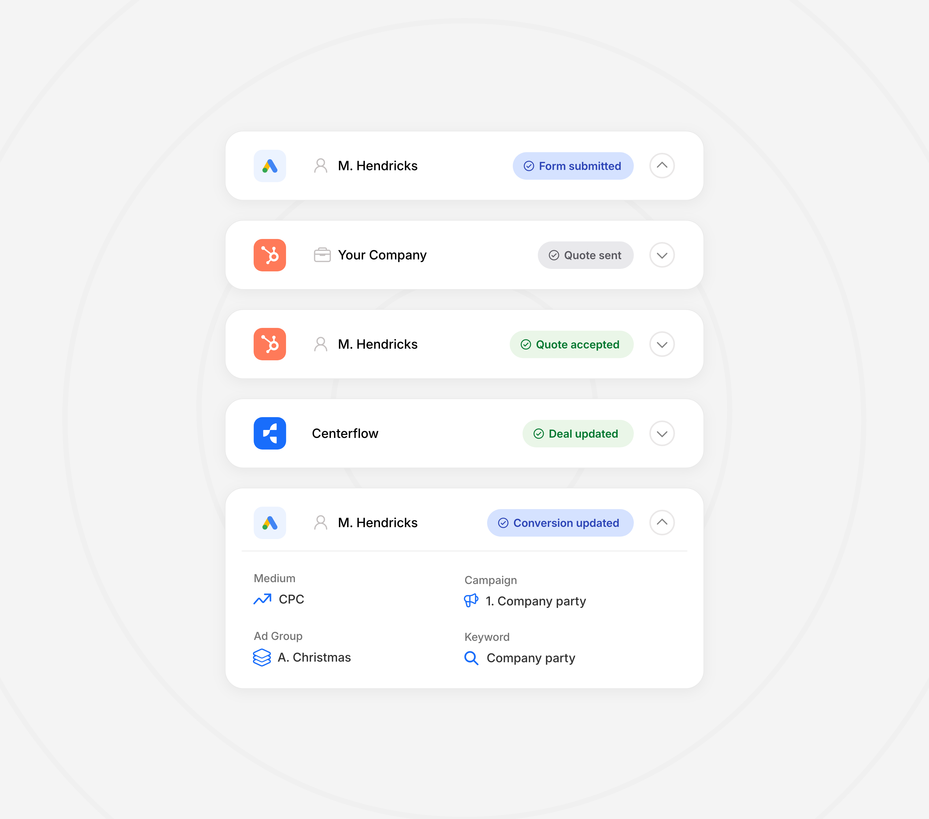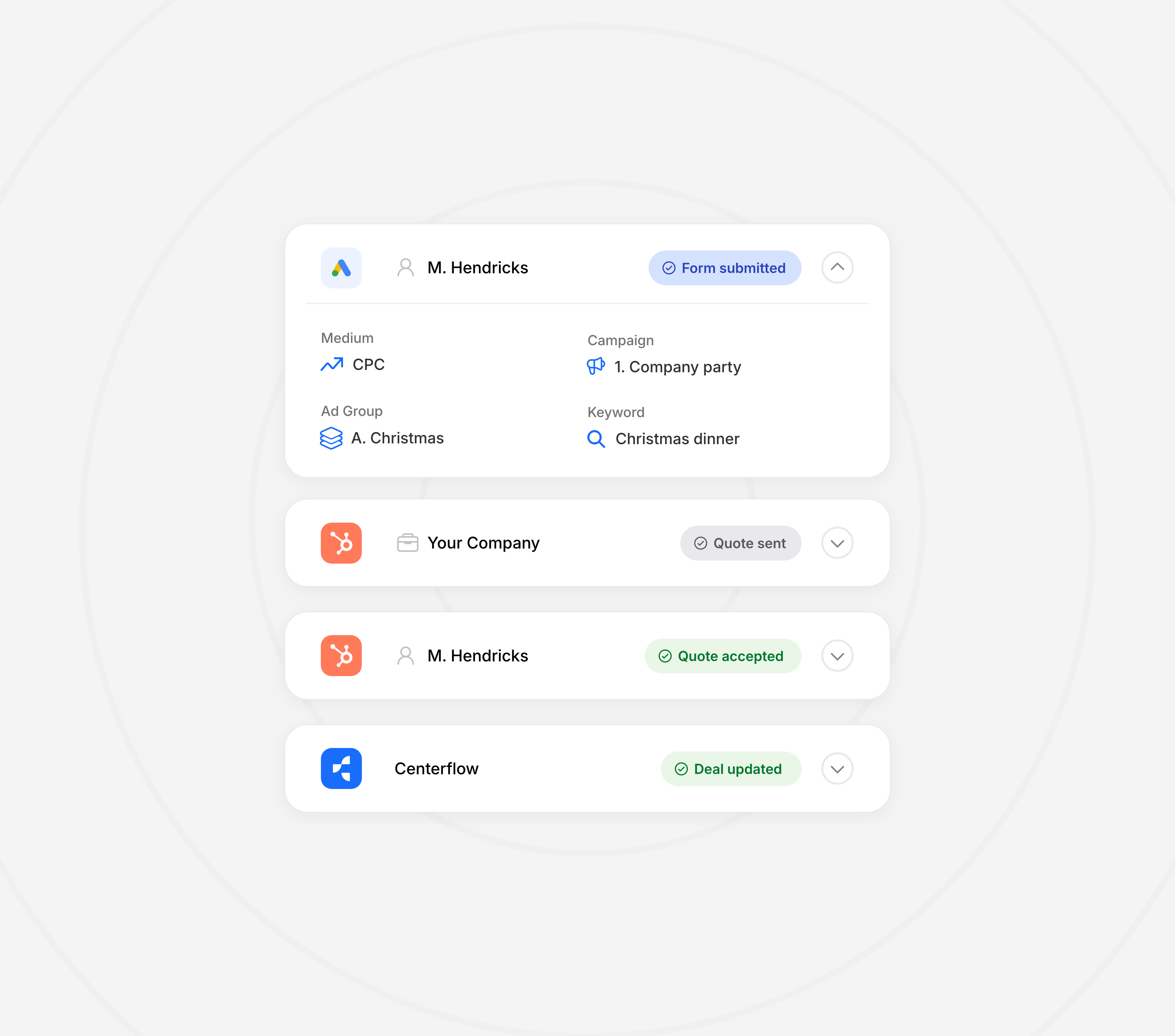 Centerflow is gebouwd voor lange en complexe klantjourney’s. Of een verkoop dagen of maanden duurt, alle contactpunten zijn verbonden. Je ziet hoe vroege interacties—ads, content, e-mail—bijdragen aan deals die veel later sluiten.