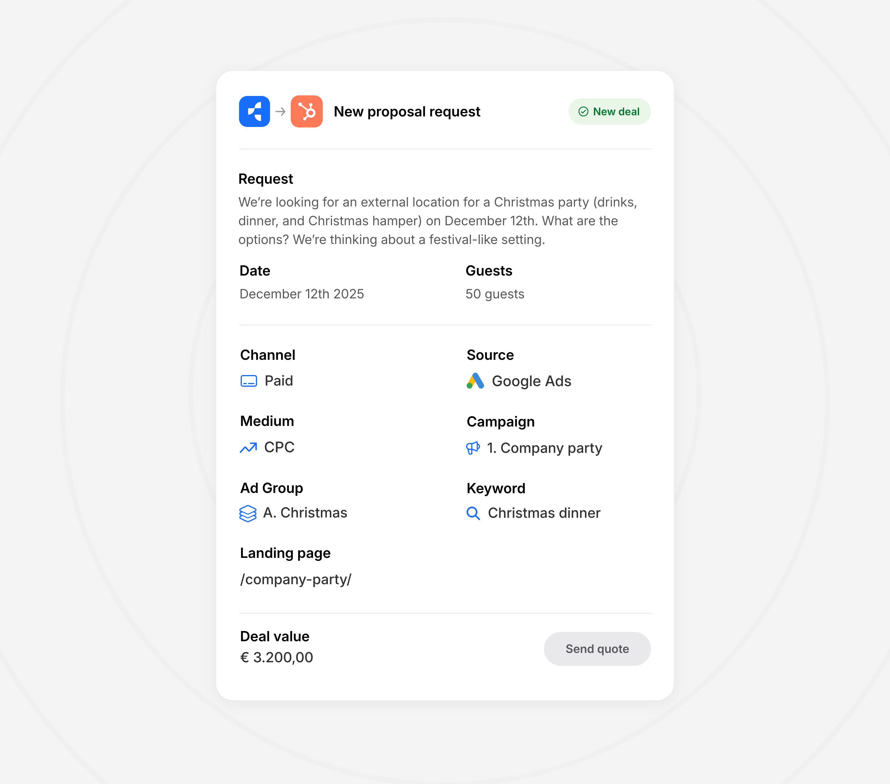 Niet alleen een naam in je CRM, maar het volledige verhaal. Je ziet welke campagne, welke zoekwoorden, hoeveel bezoeken en de complete klantreis. Je team weet meteen of het om een €2-lead of een €50-lead gaat. Dat maakt elk gesprek scherper.
