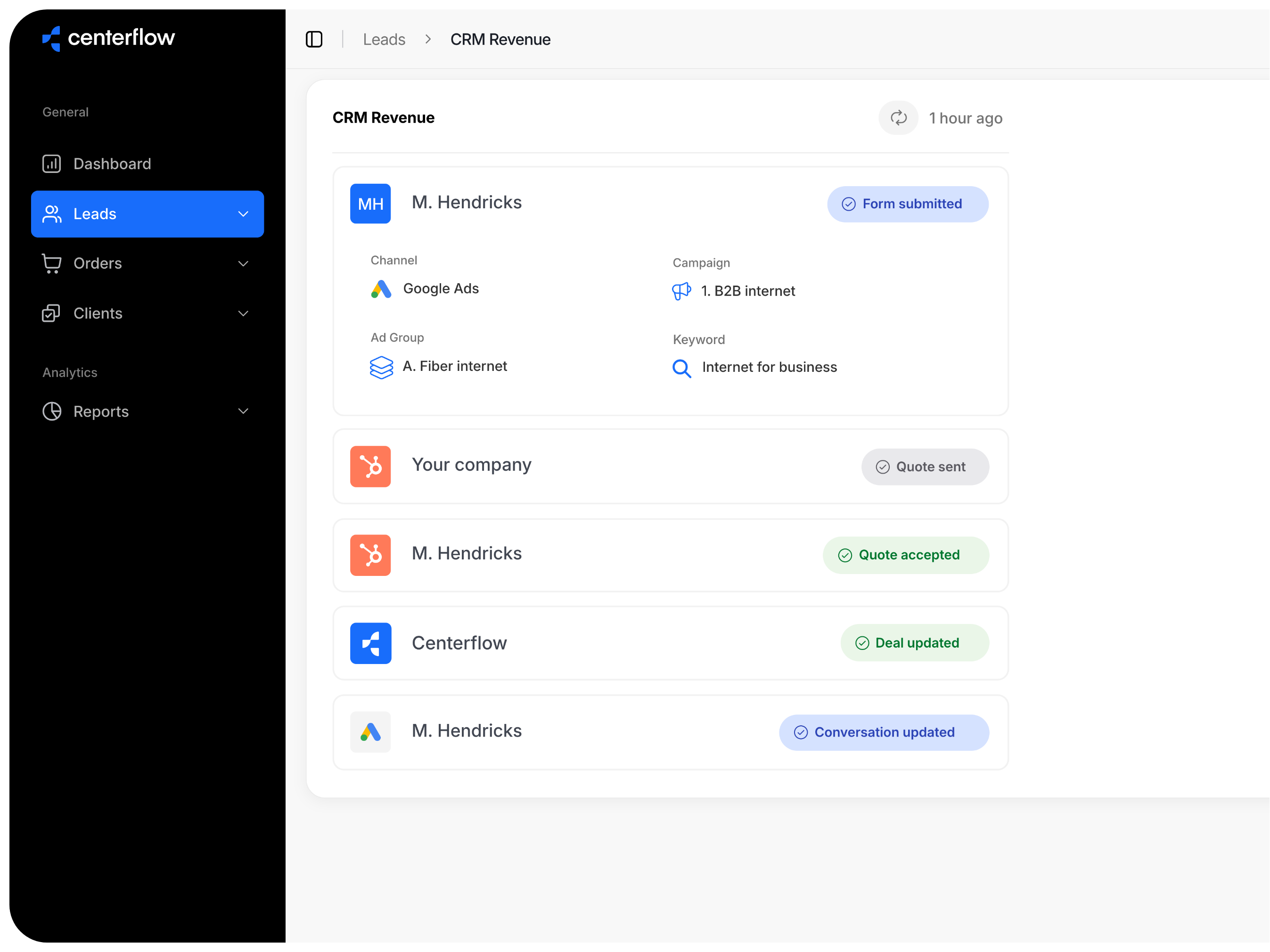 Tweerichtings-CRM-sync toont echte marketing-ROI. Leads stromen met volledige attributie je CRM in, terwijl deal-updates terugsyncen naar Centerflow. Verbind echte verkoop aan de campagnes die ze genereerden.